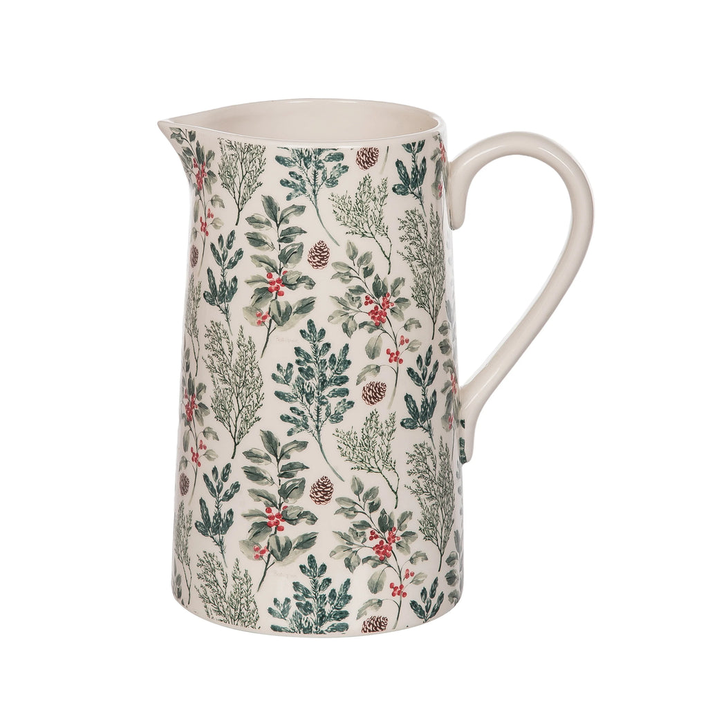 Ceramic holiday branches pitcher. Dimensions: 8.75 in x 6.25 in x 10.25 in.  Use as a pitcher or a vase - beatiful detail.  Must see, quality product.