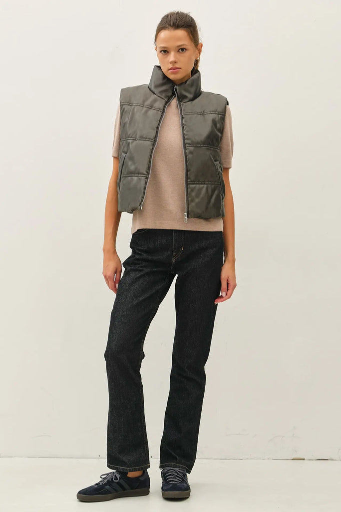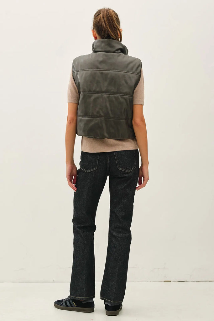 Grey leather look puffer with pockets, zipper and high neck. 100% polyester. Fan favorite, super comfy