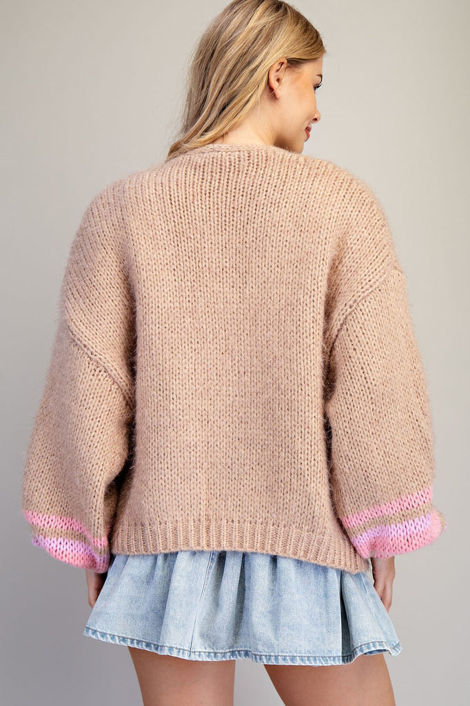 Berry and oatcolored stripped bubble sleeve open cardigan. Showcaes a soft open knit construction